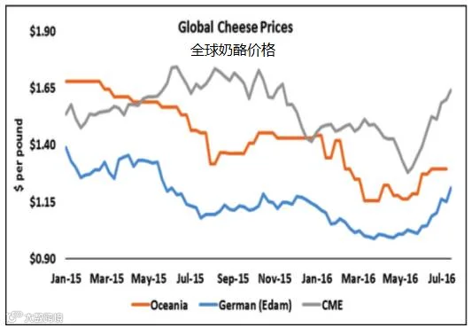海外奶酪市场的价格也在攀升。本周德国的红波奶酪(原产地荷兰)平均价格为2400欧元/吨,达到13个月的高价。如今的汇率使红波奶酪价格跌至1.21美元/磅,比桶装切达奶酪的周均价低43美分。