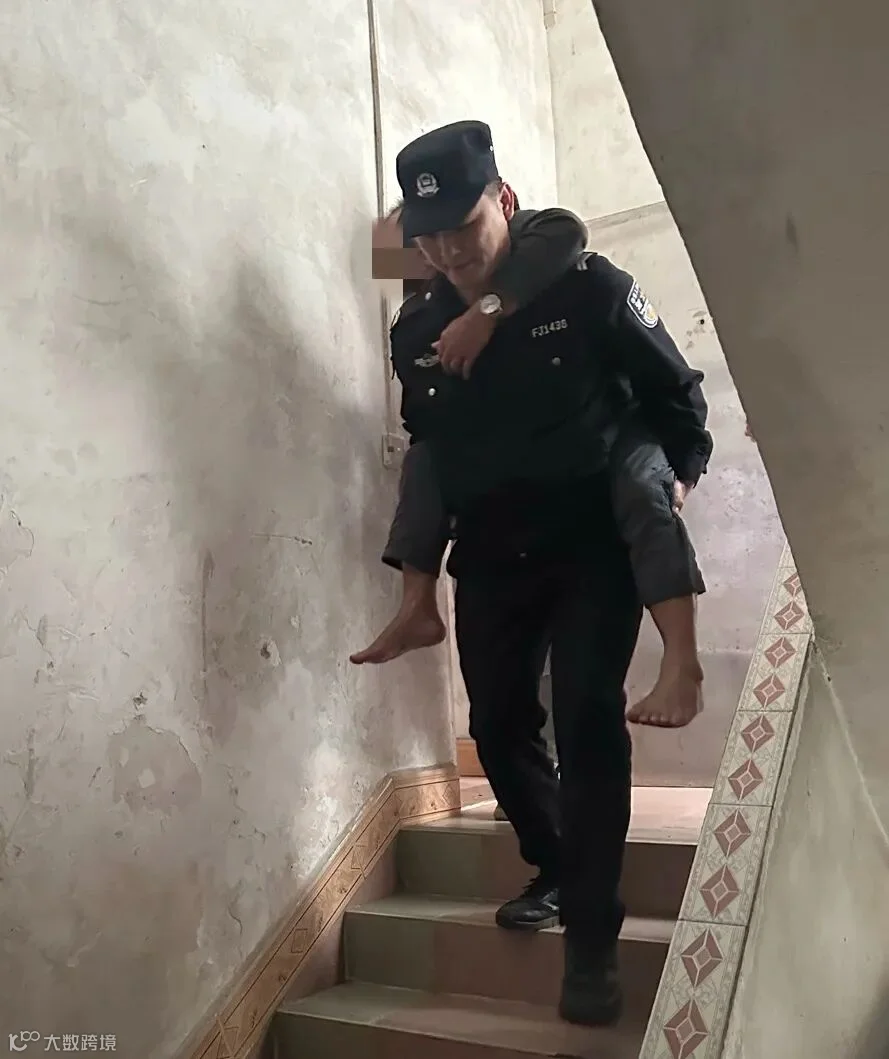 老人家在四楼,楼道空间非常狭小且有很多杂物,救护车的担架没有办法使用。时间就是生命,多流失一分钟老人家康复的几率就越低。在征询医生专业意见后,民警立即背起老人下楼,快速将其安全送到救护车。