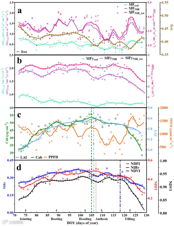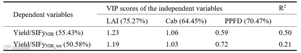 研究应用主成分分析法和偏最小二乘法的变量投影重要性分析,发现叶面积指数(LAI)和叶绿素含量(Cab)对SIF–产量关系有重要影响。其中,LAI的影响更大。两者都存在一个“最佳范围”。