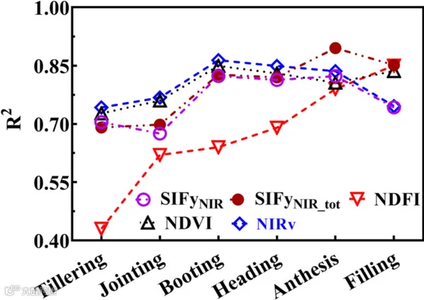 在开花期测量的总近红外SIF(SIFNIR_tot)与产量相关性最高,是该时期最佳的产量预测指标。