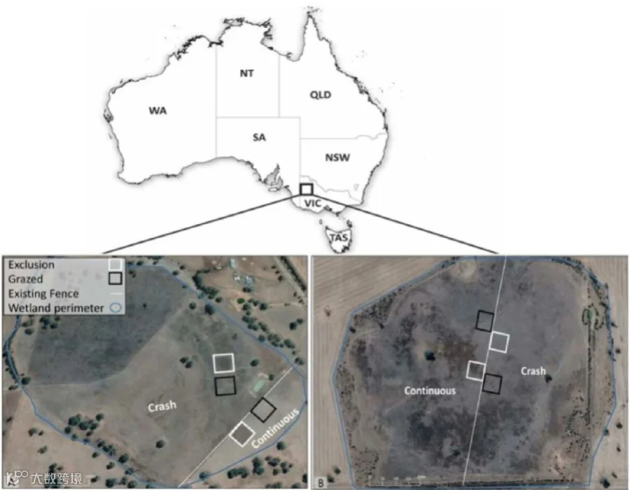 研究团队在澳大利亚东南部威默拉地区开展了一项为期一年的研究,重点比较两块雨水充沛、季节性淹没的淡水湿地(Kealy农场和Smith农场)内各种放牧机制对碳储量(植物生物量和土壤碳)和季节性碳通量的影响。