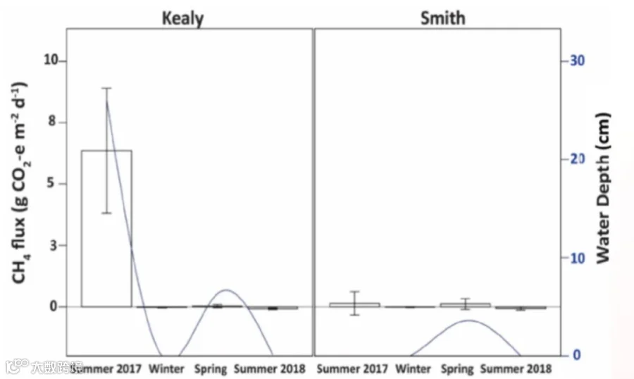 各湿地生态系统及不同季节的CH₄通量与水深变化。2017年初夏Kealy湿地遭遇孤立风暴事件期间,在高水位条件下出现了甲烷排放峰值。