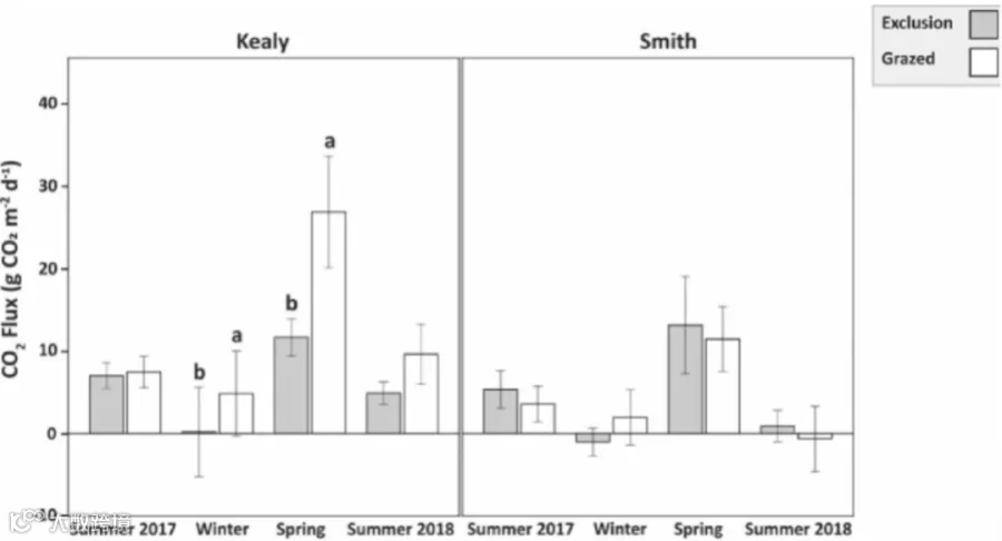在两处研究的湿地生态系统中,隔离和开放试验区的CO₂通量季节性变化(Kealy)。灰色柱状图代表隔离试验区,白色柱状图代表放牧试验区。