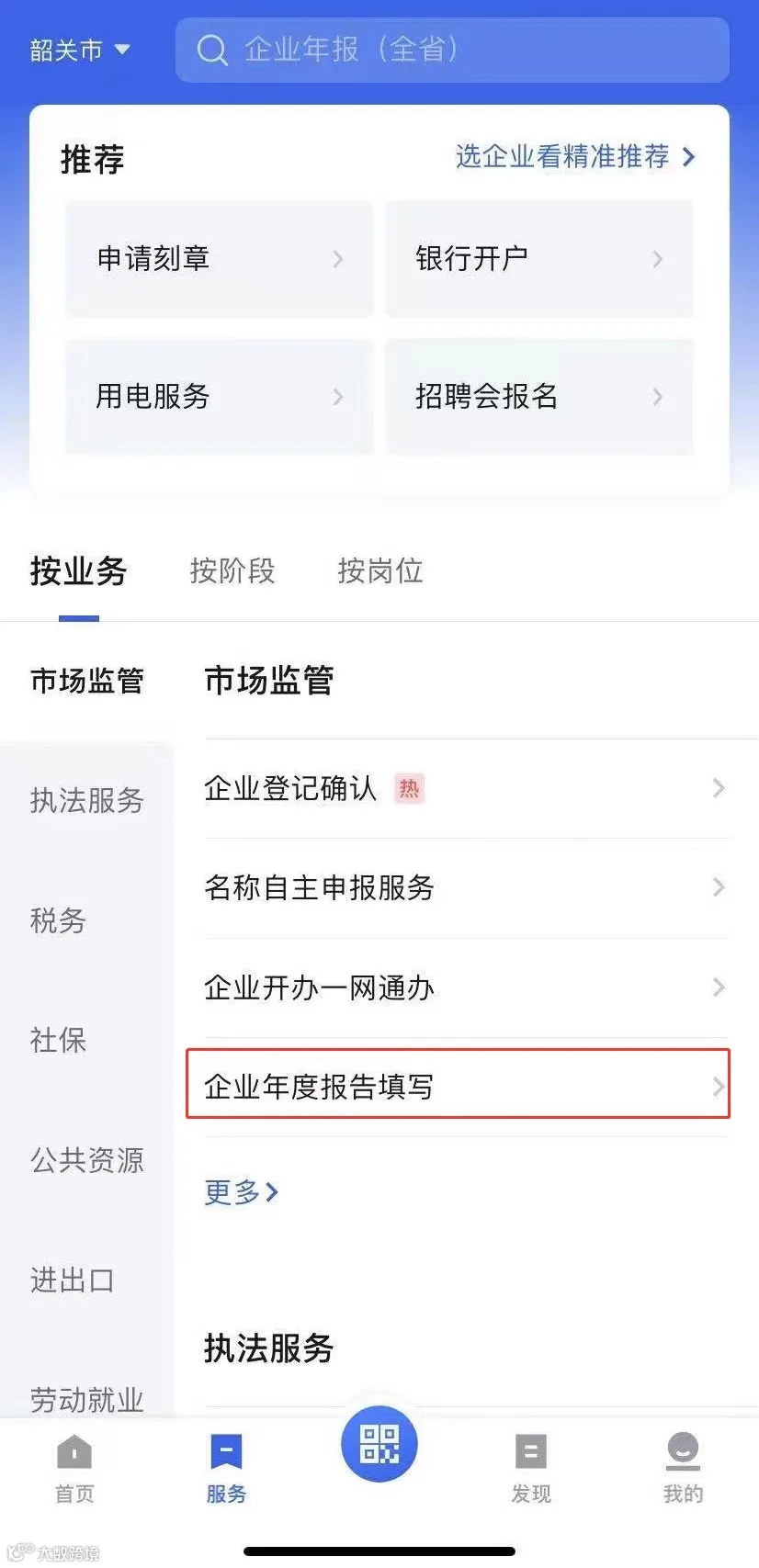 关注“韶关市场监管”微信公众号,点击菜单栏“办事窗口——企业年报”。