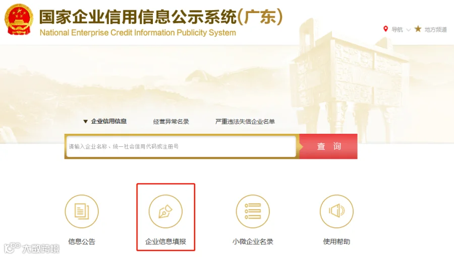 请使用IE8及以上版本登录国家企业信用公示系统(广东),点击企业信息填报。
