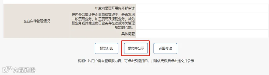 6. 确认无误后点击“提交并公示”、“确定”,完成年报公示;如未点击“提交并公示”,则所填写信息仅保存成功,未进行公示,年报未完成。