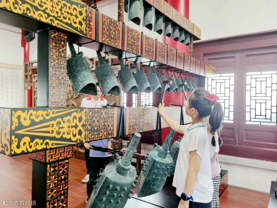 市民游客在韶阳楼体验敲编钟游戏。刘嘉健 摄