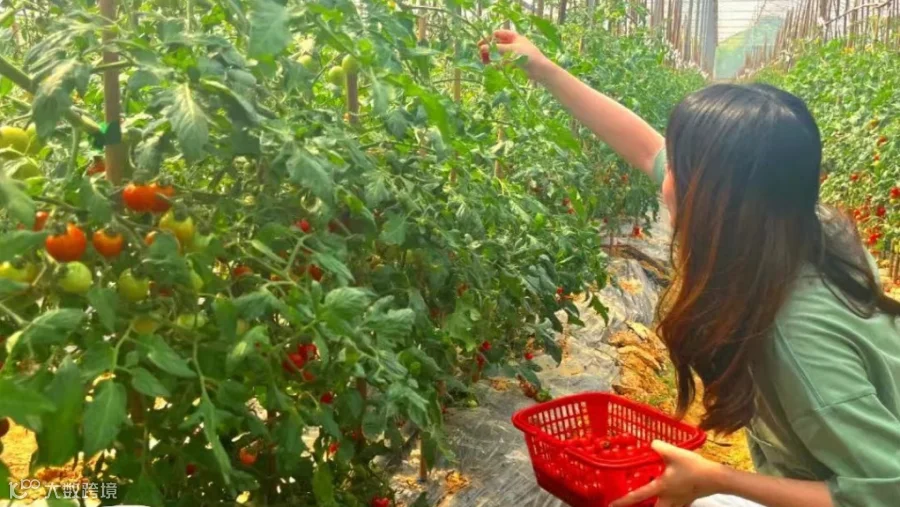 游客在农庄体验摘果乐趣。