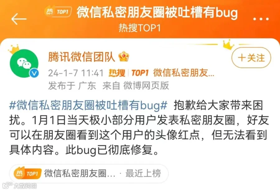 针对“微信私密朋友圈被吐槽有bug”,