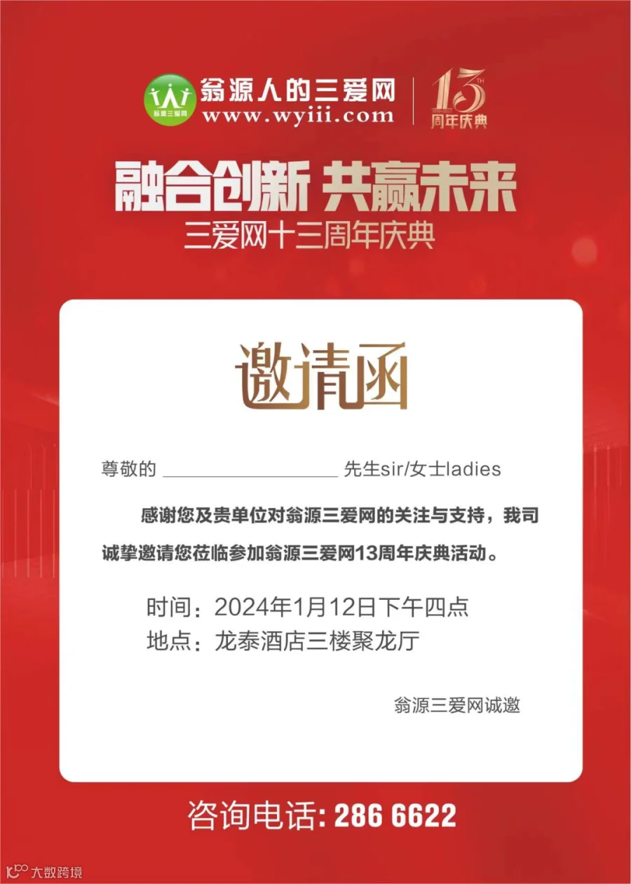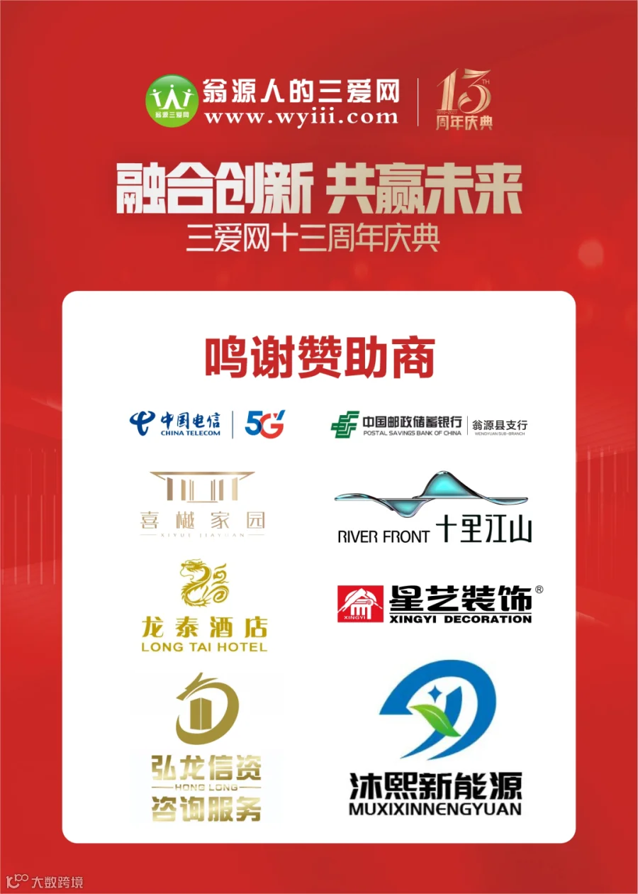 三爱网13周年庆典,是一个促进交流与合作的绝佳机会,届时将有各界人士、领导嘉宾以及我们公司优秀的员工齐聚一堂。欢迎翁源各商家一起分享思想、交流经验、探讨发展新方向。