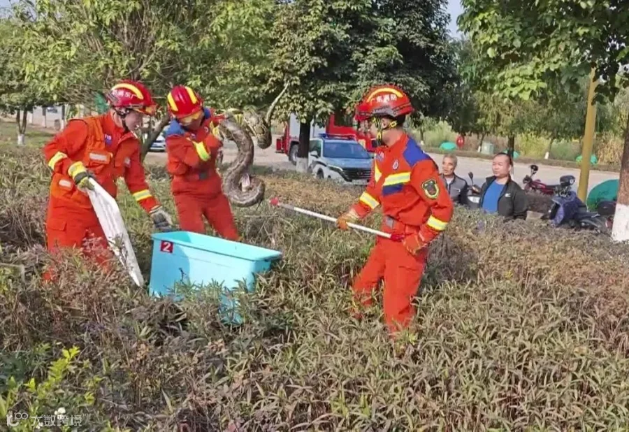 1月8日,汕昆高速龙仙西出口附近来了一名“不速之客”——大蟒蛇,不知如何处理的村民立即拨打“119”求助,消防救援人员火速赶往现场抓捕。