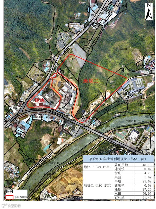 地块面积:总面积244.32亩,已征收土地56.81亩。其中有林地91.42亩,水田56亩,采矿用地48亩,旱地25亩,裸地17.2亩,村庄4.76亩,果园1.62亩,建制镇0.1亩。允许建设区亩104.12亩,有条件建设区49亩,限制建设区91亩。地块分为地块一、地块二,其中地块一面积为48.12亩,主要为商店、机关单位等建筑物,地块二面积为196.2亩,主要为有林地和旱地