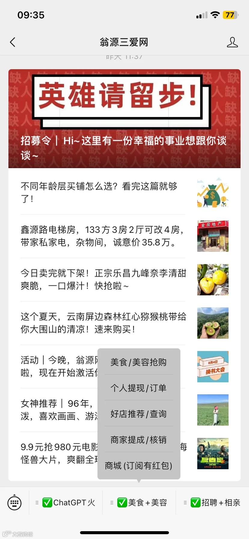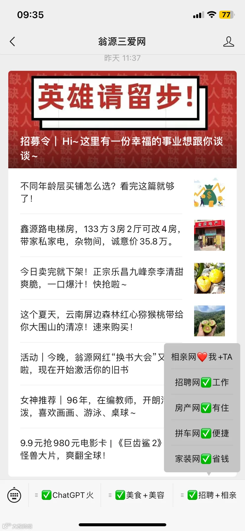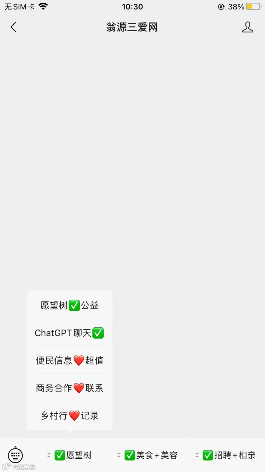 该菜单栏的版块有:ChatGPT聊天、便民信息、电影美食、乡村振兴、商务合作。