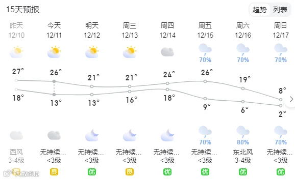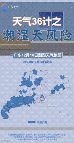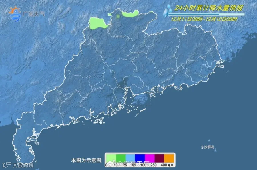 12月12日,粤北市县阴天,有小雨,珠江三角洲中北部市县多云到阴天,有分散零星小雨,其余市县多云,局部有小雨。最低气温:粤北偏北市县10-13℃,南部市县19-23℃,其余大部13-18℃。