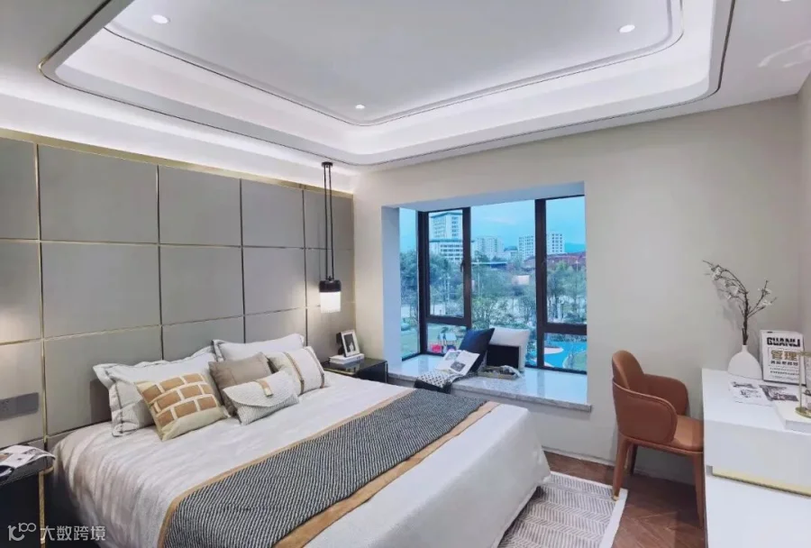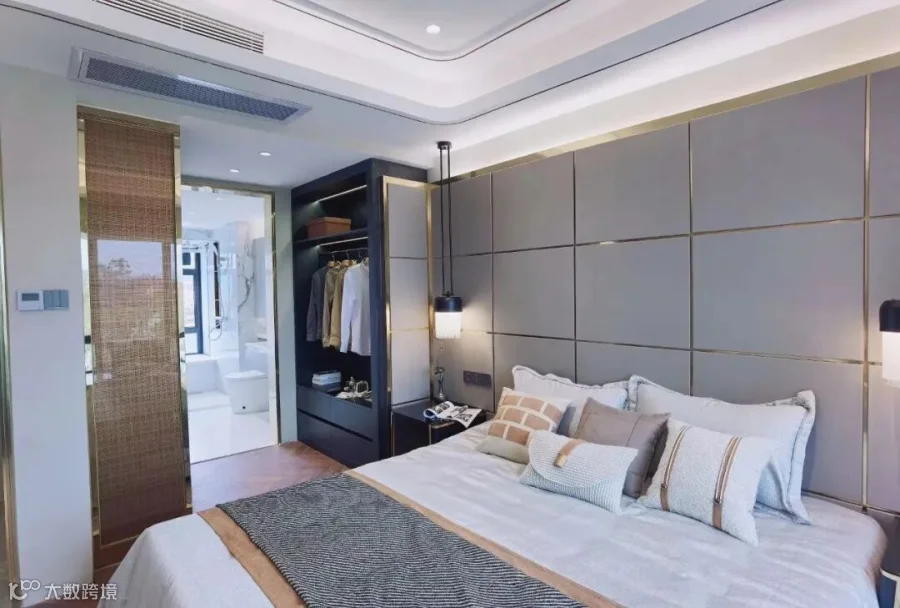 其次,主卧套房空间,在能容纳双人床和大尺寸家具的同时,尚能留下宽敞走道,避免磕碰;浪漫飘窗,清风阳光与花香盈室,氤氲着的优雅与舒怡,给予主人一隅高雅天地;独立卫浴间,如若早起或是晚归,男女主人盥洗净面互不打扰,私密安静;步入式衣帽间,暗藏了走入时的仪式感,让女主人享受女王般的心境待遇。