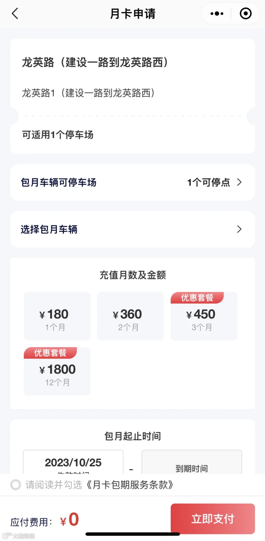 进入月卡申请页面→选择具体包月路段→选择车辆。