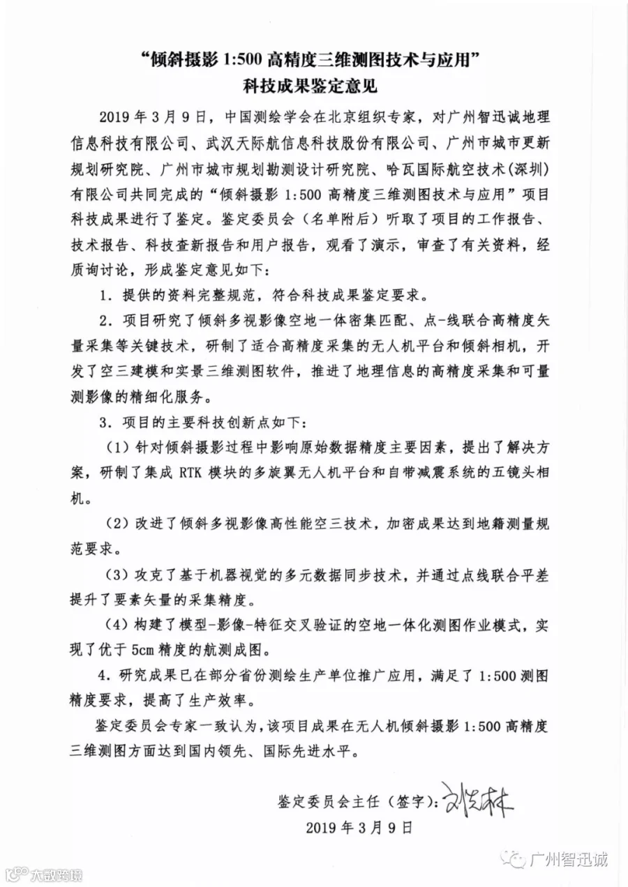 广州智迅诚地理信息科技有限公司主导研发的“倾斜摄影1:500高精度三维测图技术”,是目前国内领先的通过航测手段高效实现中误差优于5cm的大比例尺测图技术方案。