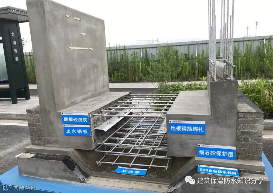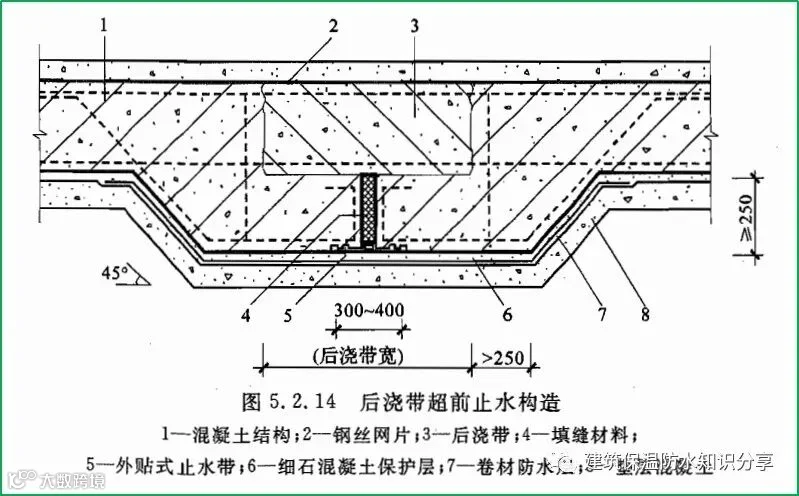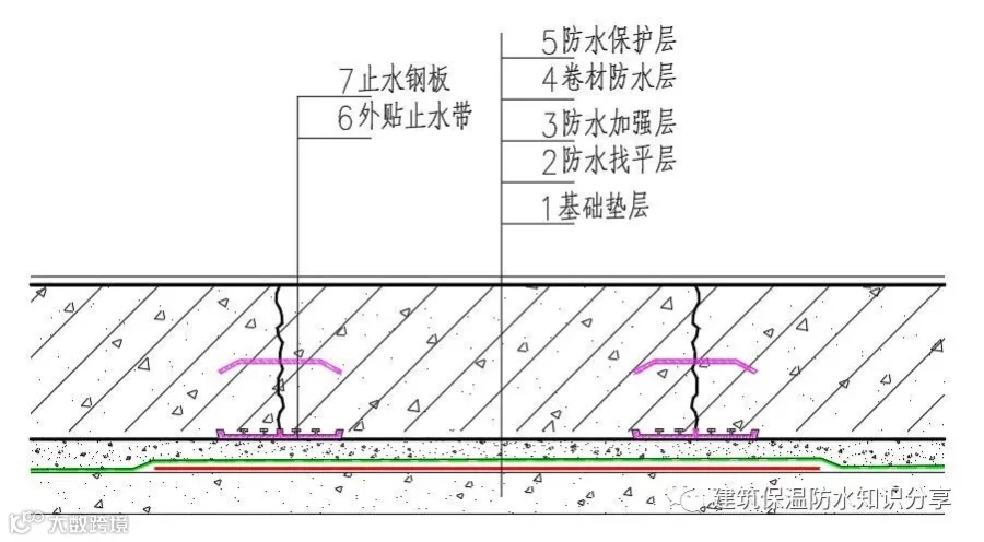 题干:项目部编制的基础底板混凝土施工方案中确定了底板混凝土后浇带留设的位置,明确了后浇带处的基础垫层、卷材防水层、防水加强层、防水找平层、防水保护层、止水钢板、外贴止水带等防水构造要求,如下图