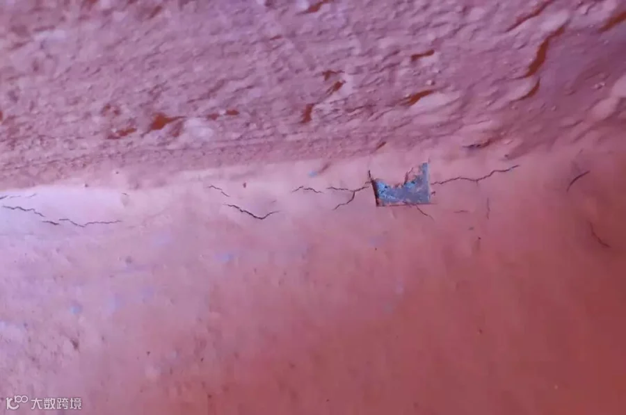 原因:部分基层平整度不足,防水涂料在基层凹陷处堆料,导致涂膜表面已经干燥了,而里层的涂料还没干透,从而导致内外收缩应力不同,产生收缩差,形成表面裂纹。
