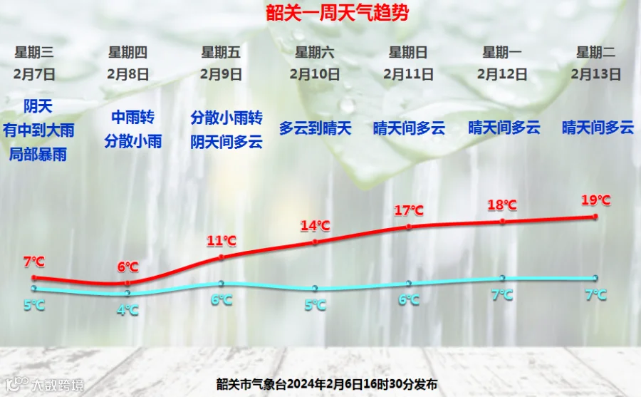 预计,6日夜间到8日夜间我市阴雨寒冷天气持续,其中,6日夜间到7日有中到大雨、局部暴雨;8日中雨转分散小雨;8日夜间到9日分散小雨转阴天间多云。6日夜间到8日夜间乐昌和乳源高寒山区最低气温-3到-1度,有冻雨、冰冻和道路结冰;9日(除夕)白天逐渐转多云,道路结冰逐步缓解;10到13日(年初一到年初四)天气晴朗,昼夜温差大,白天气温明显回升。天气寒冷,请注意防寒保暖;雨天路滑,能见度低,春运出行需注意交通安全。