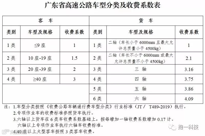 1至6类货车的收费系数分别为1、2.1、3.16、3.75、3.86、4.09;