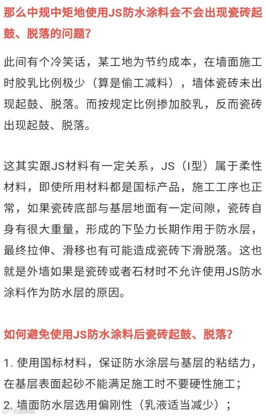 综上所述,使用JS防水涂料做卫生间防水后,瓷砖起鼓、脱落责任大多不在防水。但为了避免不必要的纠纷和无助的申辩,在防水施工前及施工后应做必要的检查(检查基层是否合格)和提醒(提醒甲方后续施工事项)。