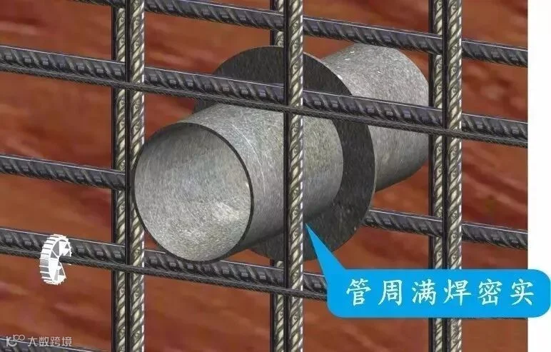 所有穿过防水混凝土的预埋件,必须满焊止水环,焊缝要密实无缝。环片净宽不小于40mm,大管径的套管不得小于80mm,安装时必须固定牢固,不得有松动现象。