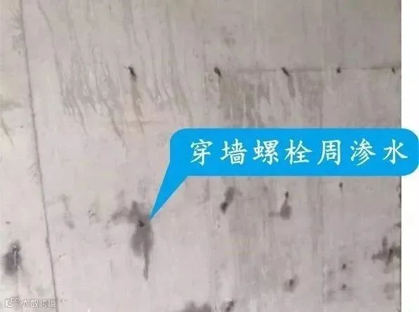 表现形式:外墙及水池墙体穿螺杆处有渗水现象。