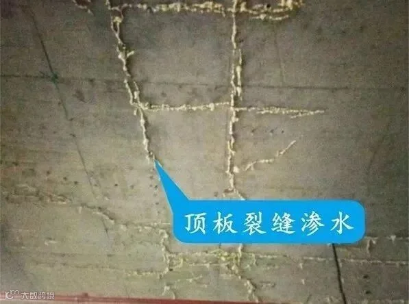 表现形式:地下室顶板出现有规律的井字形分块裂缝并有渗漏水现象。