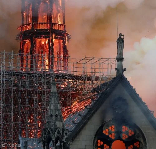 ▲正在燃烧中的巴黎圣母院塔尖。图源:网络