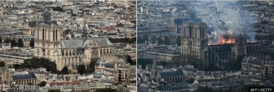 ▲巴黎圣母院起火前后。图源:法新社