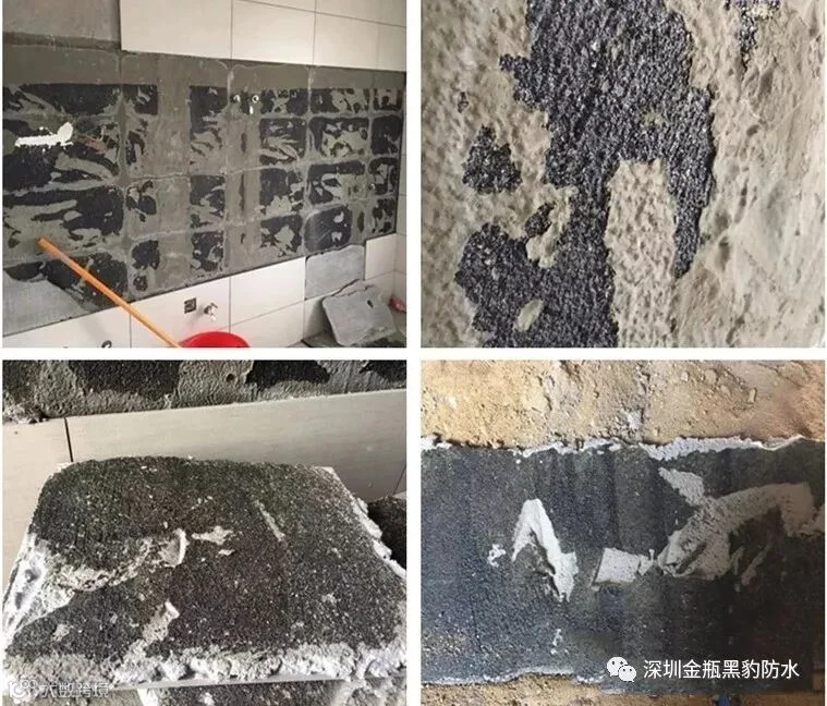 然而该两种防水材料因为材质的根本区别,存在明显的不相容,这层黑色油性物质隔绝了聚合物防水层与墙面的粘结,导致两者的粘结力无法满足贴砖的基本要求,导致防水层粘结强度无法承受瓷砖及粘合剂的重量,最终出现空鼓脱落问题。