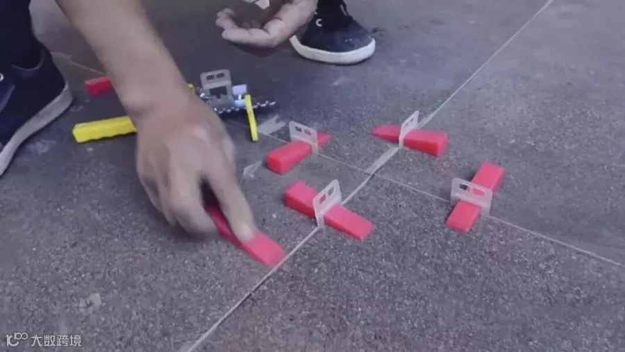 将瓷砖平整地铺贴在基层上,使用橡胶锤将瓷砖拍实铺平,便于排出气泡,轻敲砖面,让砖底能全面吃浆,以免产生空鼓现象。用木锤把砖面敲平整的同时,以靠尺测量,确保瓷砖铺贴水平。