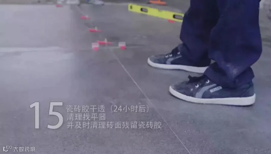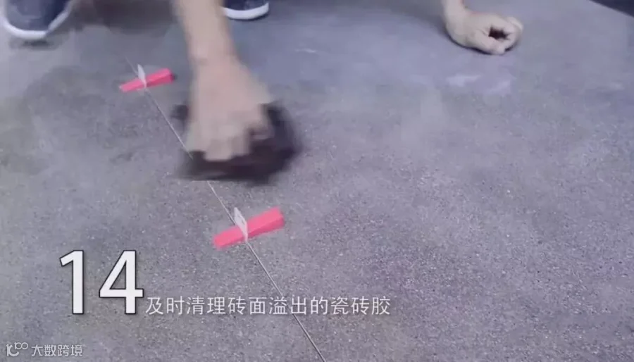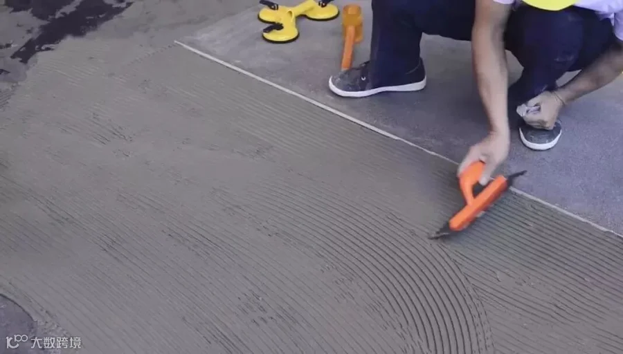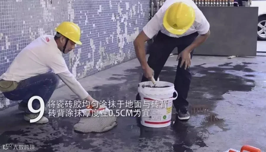 在地面均匀铺上一层瓷砖胶,形成半干的一层,再次用瓷砖胶填平表面凹凸处,厚度为0.5CM左右;适当条件下,可同时将瓷砖胶均匀地抹在瓷砖背面,要求瓷砖胶涂抹饱满。
