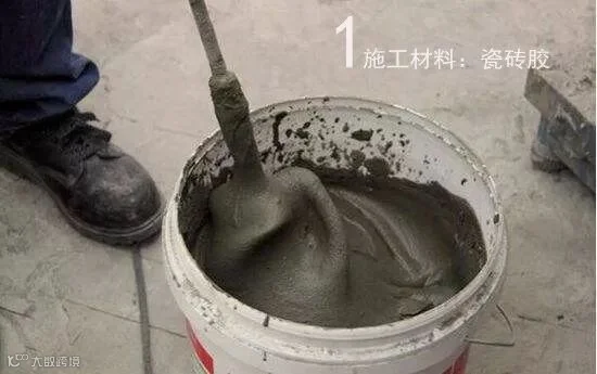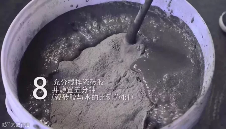 将瓷砖胶与水4:1配置,用灰勺搅拌至润滑均匀,无明显块状或糊状结块,搅拌后的浆料静置5-10分钟后再稍加搅拌1-2分钟即可使用。