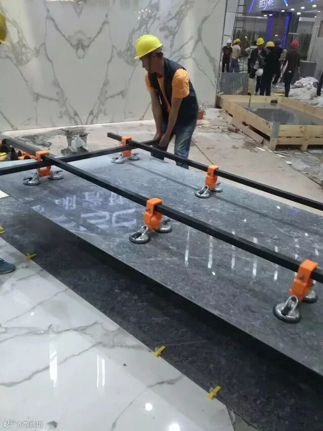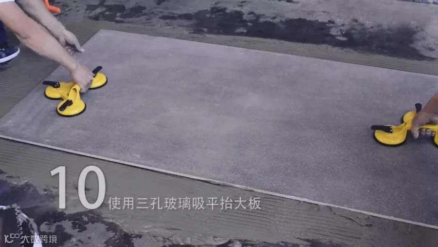 用三孔玻璃吸工具平抬大板平移施工位置,放置到铺好瓷砖胶的基面上,至少需要2名工人进行搬运;面积更大的使用移动架搬运。