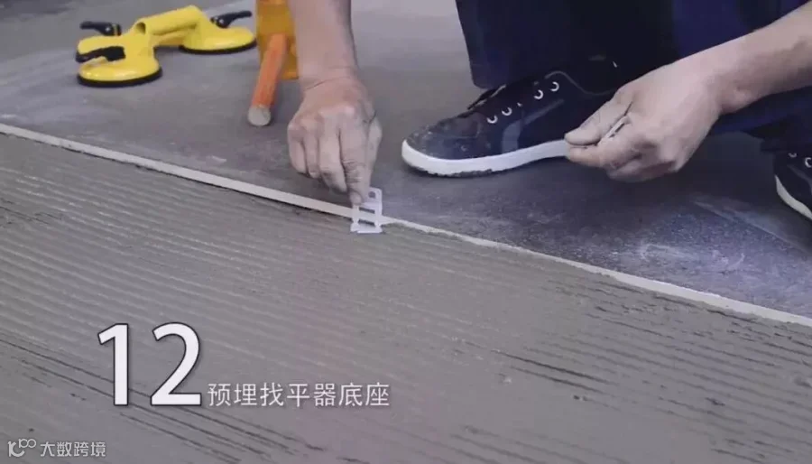 在已定位好的大板边缘周围每60cm左右插入找平器底座,检验平整后插入找平楔子并夹紧找平器,调节相邻大板的表面平整度,并将大板间隙调整为2mm左右,以便后续美缝剂处理。