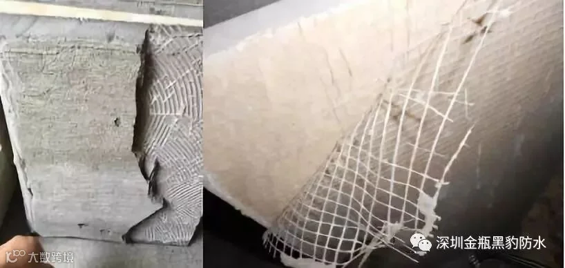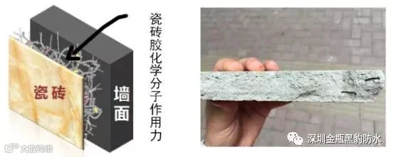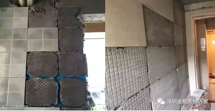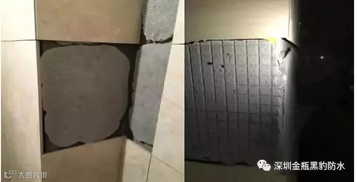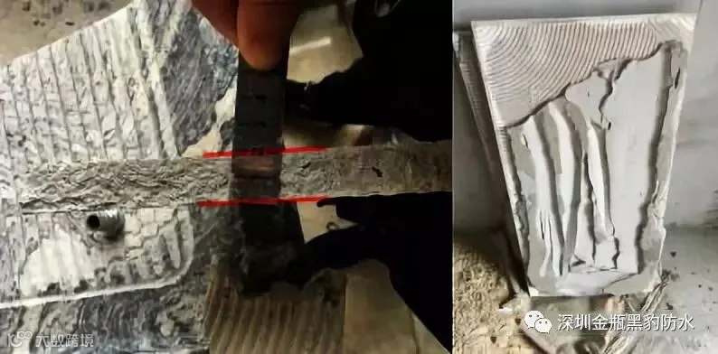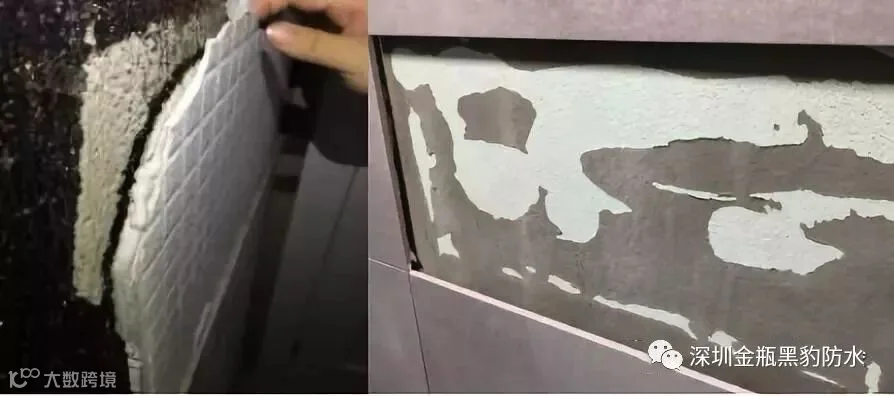 由于基层状况不佳(例如防水强度较差、油性防水、腻子层没有清理干净就直接贴砖等),瓷砖胶跟基层之间极有可能出现空鼓,这时一旦产生震动或形变应力,这种力传递到瓷砖和瓷砖胶之间,就会破坏其吸附效果,可能导致瓷砖“光秃秃”地脱离。