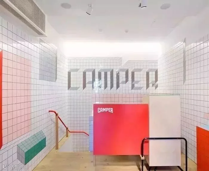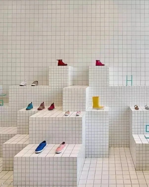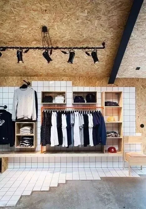 墙面和地面的主体分别使用了质感较为粗糙的木屑颗粒板和水泥,但又在主体上看似随性地铺了一层白色格子瓷砖,瓷砖的精致与粗糙形成鲜明的对比,营造了一种独特的购物环境。