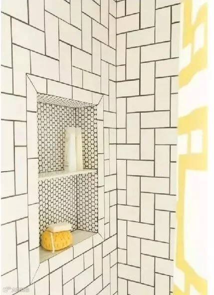 白色瓷砖作为基础墙面,再用一些不同颜色和形状的瓷砖打破常规,在平面上重新结构出一种3D立体的视觉错觉。