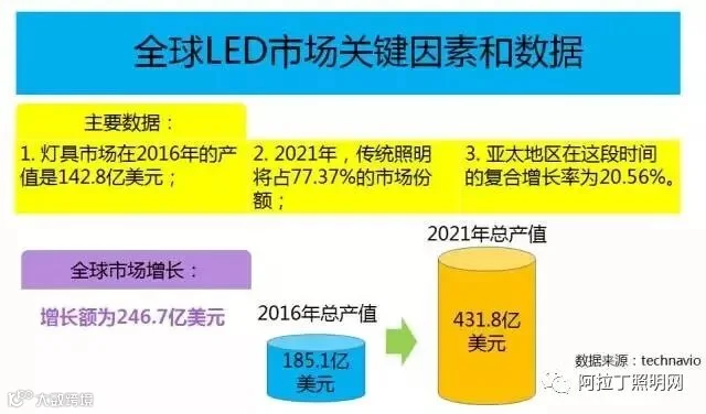 咨询公司Techavio预测,2017-2021年全球LED市场的复合年增长率(CAGR)将大于18%,产值从2016年185.1亿美元升到2021年的431.8亿美元,主要由对节能照明需求量的增加引起。值得注意的是:
