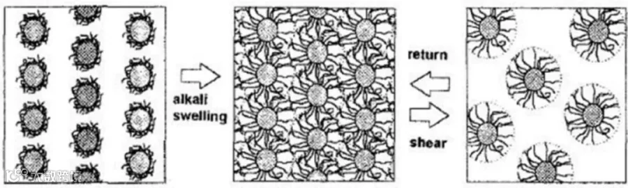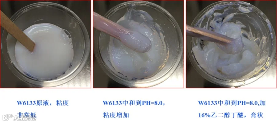 一些乳液类树脂(如丙烯酸乳液)因其自身具备特殊的结构设计,其乳胶粒子具备在胺类中和剂和/或助溶剂的作用下迅速溶胀的特性,并在表面同种电荷间排斥力的作用下迅速挤占大量的自由空间。