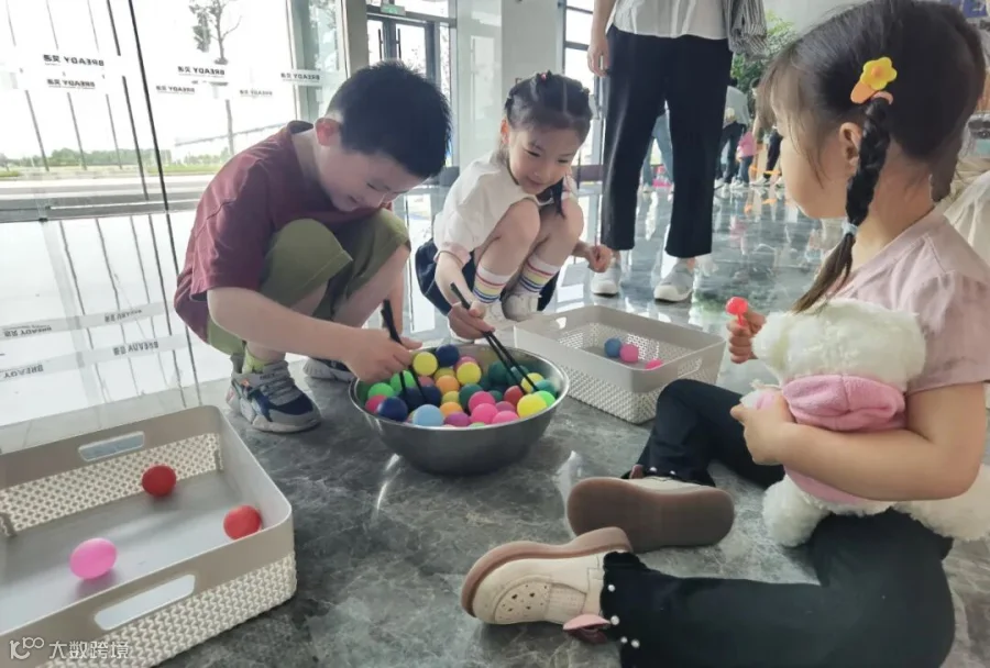 ,小朋友们又跟随主持人姐姐去大厅进行亲子游戏。本次游戏设置了夹乒乓球、套圈、你抛我接、两人三脚等亲子互动环节,