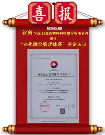 成功获得认证是南京贝迪新材料科技股份有限公司一个重要的里程碑,公司将以此次通过管理体系认证为契机,大力促进公司的两化融合管理体系建设开展,进一步提升公司综合竞争力,发挥领先的技术、人才、设备、研发优势,以更高的品质服务全球客户。