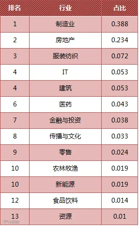 制造业是浙江地区上榜富豪从事最多的行业,占浙江所有上榜富豪的38.8%,高于百富榜上制造业的比例;房地产位居第二,占23.4%;服装纺织排名第三,占7.2%。去年百富榜上,前两名行业同样是制造业和房地产,比例分别为23.1%和19.8%;金融与投资业排名第三,占比10.1%