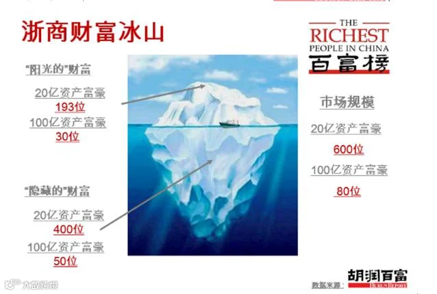 浙商:在去年胡润百富榜上,全国20亿资产富豪人数已经有1271人,其中浙商(包括总部在浙江或出生地在浙江的企业家)共有193位,总财富13,669亿元,平均财富71亿元,高出百富榜平均财富7亿元。如加上隐形富豪,应该能有600位浙商有资格登上胡润百富榜。财富上百亿的浙商有30位已经上榜,而应该能有80位浙商财富都已经达到上百亿。