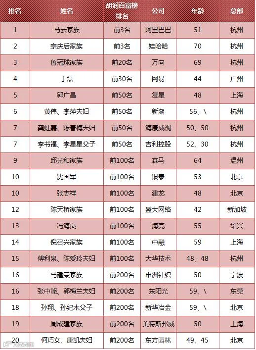 ● 阿里巴巴51岁的马云成为浙商首富;第二名是“饮料大王”娃哈哈70岁的宗庆后;第三名是万向69岁的鲁冠球。其他上榜的著名浙商还有:网易的丁磊、复星的郭广昌和盛大的陈天桥等。