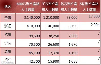 浙江地区高净值人群数量全国排名第4,其中,600万资产富裕人士已经达到41万人,比上一年增加3.01万人,占全国13%;千万资产富裕人士14.6万人,比上一年增加1.3万人,占全国12%;亿万资产富裕人士8,790人,比上一年增加990人,占全国11%;5亿资产以上的超高净值人士2,004人,占全国11.8%。