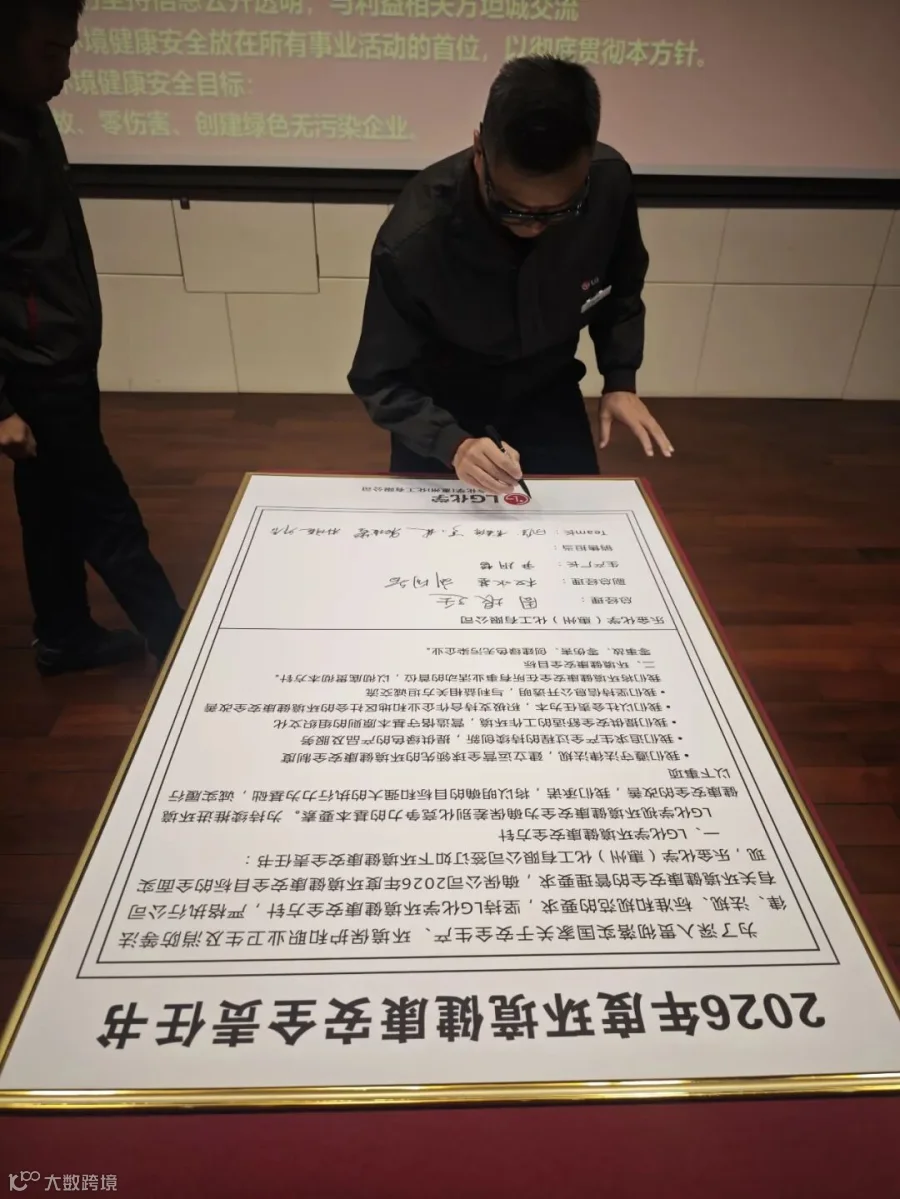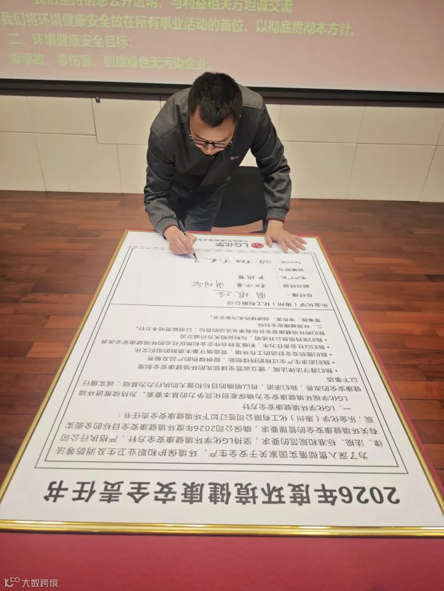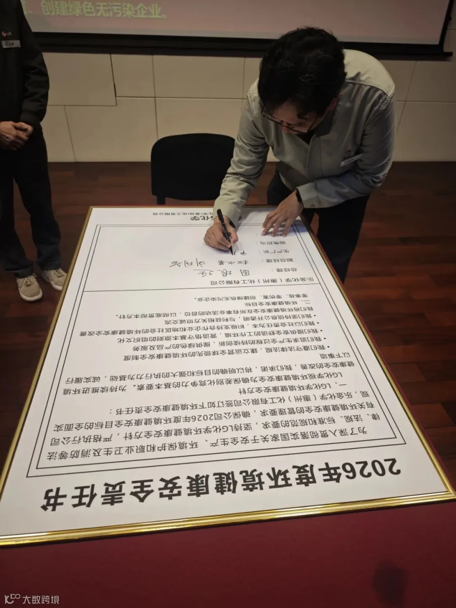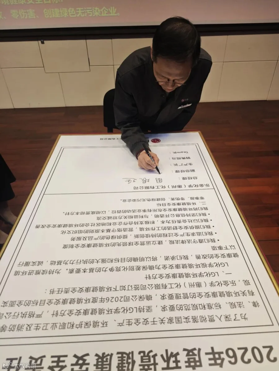 员工们在“环境安全第一, 遵守基本原则,清洁安全惠州工厂,健康幸福家庭“横幅上签字,并承诺严格遵守公司环境安全健康规定,达成2026年环境安全高度化目标。