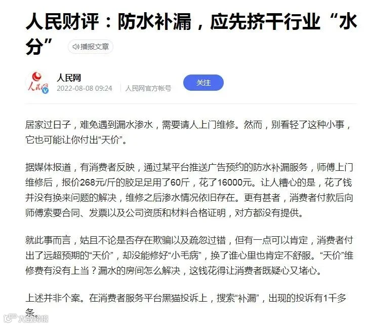 据媒体报道,有消费者反映,通过某平台推送广告预约的防水补漏服务,师傅上门维修后,报价268元/斤的胶足足用了60斤,花了16000元。让人糟心的是,花了钱并没有换来问题的解决,维修之后渗水情况依旧存在。更有甚者,消费者付款后向师傅索要合同、发票以及公司资质和材料合格证明,对方都没有提供。